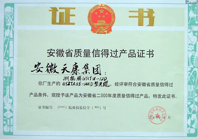 “天儀”牌工業(yè)用鉑熱電阻于97年被安徽省技術(shù)監(jiān)督局授予質(zhì)量免檢產(chǎn)品