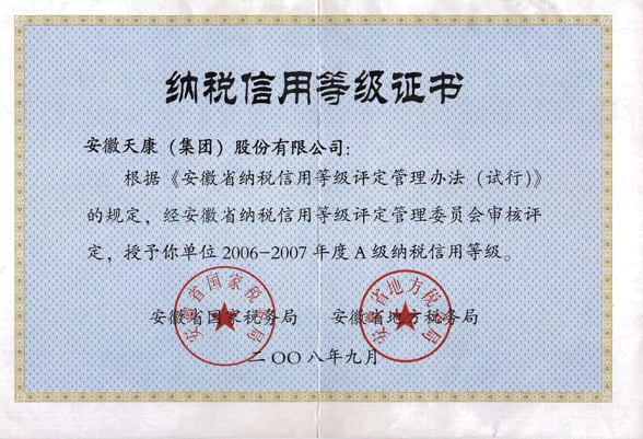 2006-2007年度A級納稅信用等級證書2008.9